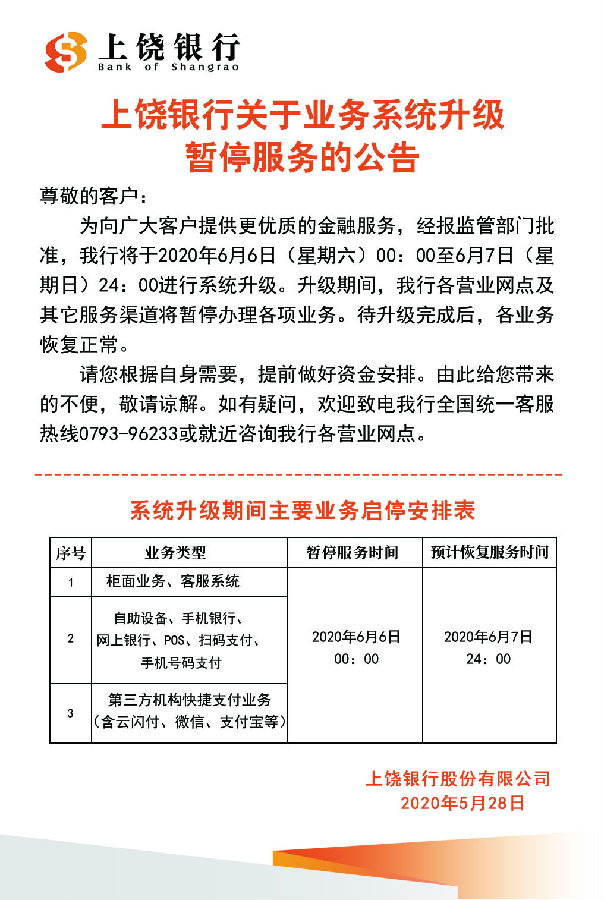 上饒銀行關(guān)于業(yè)務(wù)系統(tǒng)升級(jí)暫停服務(wù)的公告