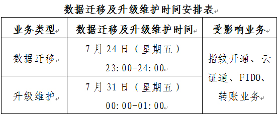 我行將于2020年7月24日(星期五)23:00-24:00、7月31日(星期五)00:00-01:00分別對掌易行云證通業(yè)務進行數據遷移及升級維護工作,期間我行云證通及FIDO業(yè)務可能出現(xiàn)短暫中斷情況。待數據遷移及升級維護完成后各項業(yè)務恢復正常。